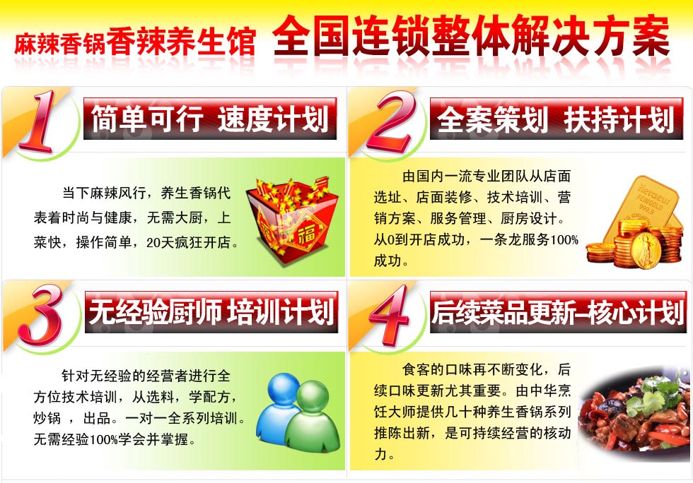 術(shù)培訓(xùn)、整體形象設(shè)計、店面設(shè)計、開業(yè)指導(dǎo)、市場督導(dǎo)、個性化跟蹤服務(wù)、定期升級服務(wù)。 2.培訓(xùn)內(nèi)容:麻辣香鍋極品鍋、麻辣香鍋精品鍋、麻辣香鍋滋補鍋、麻辣香鍋山珍菌鍋麻辣香鍋鴛鴦鍋