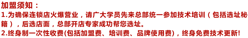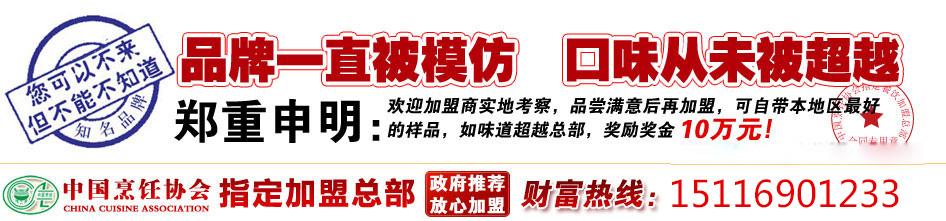 | 1、品牌支持: 品牌名稱、商標(biāo)標(biāo)識、包裝條形碼、VI體系,全部免費贈送,強力支持投資人開拓市場。利用環(huán)球餐飲的品牌知名度和號召力,吸引消費,擴大市場占有率。 2、經(jīng)營支持: 環(huán)球餐飲共設(shè)六級投資商,不同的投資商,在經(jīng)營重點、市場戰(zhàn)略方面各不相同,環(huán)球餐飲針對不同的投資商,給出了詳盡細(xì)致的經(jīng)營方略指導(dǎo),規(guī)避摸索風(fēng)險,少走不必要的彎路。 3、配方支持: 所有產(chǎn)品配方,毫無保留,全部傳授給投資商。 4、技術(shù)支持: 產(chǎn)品制作工藝、制作設(shè)備、設(shè)備維修、保養(yǎng)等全部技術(shù),悉數(shù)傳授。 5、培訓(xùn)支持: 環(huán)球餐飲專設(shè)內(nèi)部招待所,所有投資商培訓(xùn)期間,免費食宿,培訓(xùn)內(nèi)容包括:配方,工藝,設(shè)備,技術(shù),經(jīng)營方略,廠、店、攤的管理,選址要領(lǐng),裝修方案等等,學(xué)會為止,考核通過。 6、后續(xù)服務(wù)支持: 新配方、新技術(shù)、新設(shè)備的不斷開發(fā)和研制,增加產(chǎn)品賣點,讓工藝更完善,提高效率,降低成本。前期投資者,在今后均可免費獲得最新研發(fā)成果,添置新設(shè)備,一律按成本價供應(yīng),同時長年提供輔料供應(yīng)。 7、廣告支持: 針對中國市場,環(huán)球餐飲制定立體化的廣告戰(zhàn)略,品牌廣告包含影視媒體:央視、各地方衛(wèi)視,網(wǎng)絡(luò)媒體:新浪、搜狐、QQ、TOM等數(shù)十家全國性門戶網(wǎng)站;平面媒體:商界、知音、讀者、參考消息、體壇周報等全國大型期刊雜志及各地方晚報、早報等。 8、無形資產(chǎn)支持: 全套無形資產(chǎn),包含營銷理念,產(chǎn)品理念,技術(shù)骨干、管理骨干、業(yè)務(wù)骨干的培養(yǎng),營銷策劃,廣告創(chuàng)意及投放策略,業(yè)務(wù)談判,人力資源,品牌管理,財務(wù)管理,VI體系等等,上述一切除了培訓(xùn)期間面對面?zhèn)魇谥?,還將制作光盤,讓投資人反復(fù)研習(xí),直到融會貫通,運用于實戰(zhàn)。 總部承諾:傳授全套“石鍋魚”烹飪技術(shù),加盟后由總部免費提供賓館食宿。 |