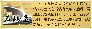 | “石鍋魚”是一道名菜,制作方法很是獨特,用一塊大的花崗巖巖石鑿成有雙耳的石鍋,將魚放在石鍋內(nèi)烹煎,然后,再加上以辣椒為主的各式佐料,又再加上一些滋補藥材,這樣,經(jīng)過一番復(fù)雜的烹調(diào)工序的操作流程之后,一鍋“石鍋魚”誕生了。當(dāng)用石鍋烹制的“石鍋魚”端上桌來時,一定會令你垂涎三尺。